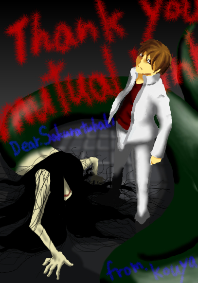 非現実じかん。の桜椿さんへの相互絵です! 一応「怖い(幽霊的な意味で)女の人」という依頼だったので、私のお気に入りの濡女を描いたのですが・・・。 文字入れしたらあんまり怖く無くなっちまいましたよっ?!Σ(´ロ`;) 色塗ってる間とかは塗女をアップにするたび「怖っ!」ってなってたんですが、後ろの文字でその全てが吹っ飛んだような気がします・・・。 んでは、桜椿さん、こんなもんで良ければお持ち帰り下さいませー。 ↓のが軽量版です。 |
